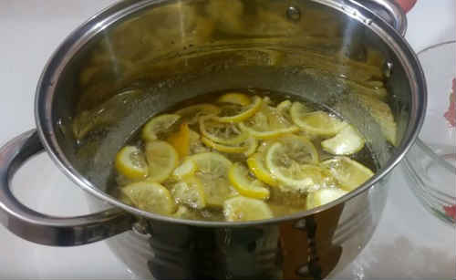 Закиньте лимонну нарізку в сироп. Дайте закипіти, налаштувавши на слабкий вогонь, проваріть приблизно п’ять хвилин.
