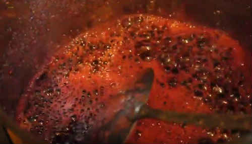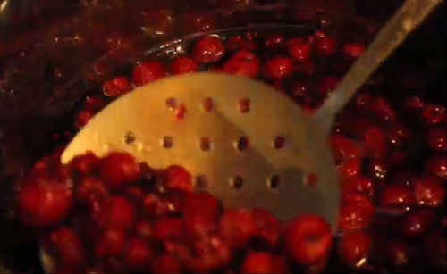 Коли маса закипить, варити рівно 5 хвилин. Потім шумівкою, викладіть ягоди миску. Разом з ягодами обов’язково потрапить трохи сиропу. Злийте його назад в каструлю.