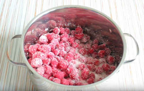 Пересипте цукром-піском. Раджу засипати малину невеликими порціями, потім, струшуючи каструлю, розподіляти солодкість по ягідці. Там чином, вона практично не помнеться і залишиться целенькой.