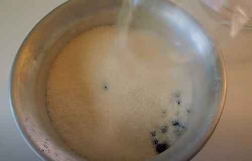 - Засипте в каструлю цукор, влийте воду. На помірному вогні, постійно помішуючи, зваріть сироп.