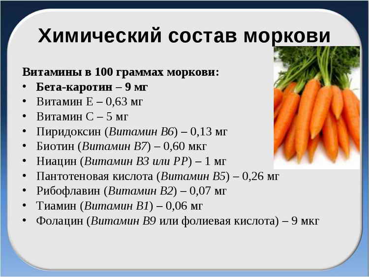 Морква – дуже багате джерело корисних елементів. Чого у складі тільки немає. Наприклад, на 100 грамів сирої морквини припадає 89 грам води, 1,3 г білків, 8 грамів вуглеводів, де 7 грамів – це суцільні моносахариди і дисахариди. Жирів у складі не більше 0,2 грам на 100 грам продукту.