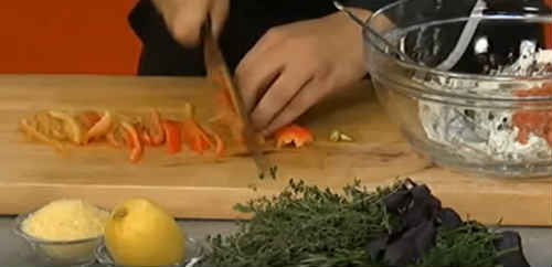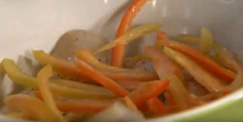 Поверх розкидайте соломку болгарського перцю.