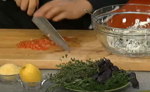 Для приготування соусу помідори обшпарте окропом, попередньо зробивши хрестоподібний надріз на плодах. Швидко опустіть в холодну воду, потім зніміть шкірку, покришіть томат дрібним кубиком.