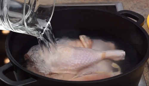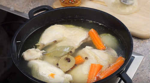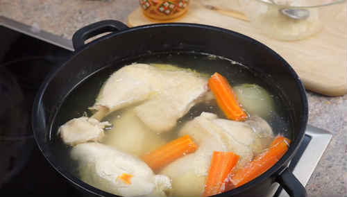 Промийте курку, знову залийте свіжою водою, поставте варитися. Даний етап можна опустити, але краще витратити трохи часу, оскільки ми готуємо святкову страву. В цей раз в каструлю закиньте цибулину, морквину, одну часточку часнику. Всі овочі кладуть цілком. Овочі зроблять бульйон набагато смачніше.