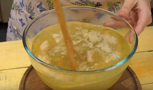 Поки рідина не встигла охолонути, додайте желатин і роздавлені пресом 2 зубчики часнику. Часточки допускається дрібно покришити, а не перетворювати в кашку. Якщо желатин погано розчиняється, трохи підігрійте бульйон.