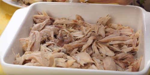 Дістаньте куряче м’ясо, розберіть, видаливши кісточки і хрящики.