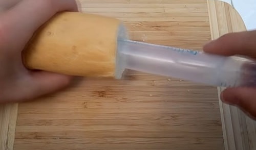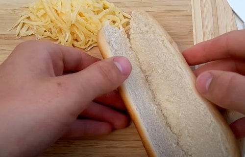 - Відріжте кінчик булки. Акуратно вийміть серединку (можна, як в першому рецепті, продавити з допомогою шприца).