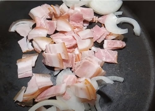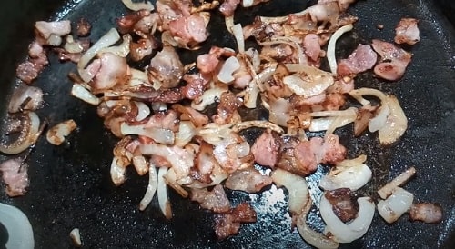 Наріжте смужки бекону скибочками. Цибулину наріжте півкільцями. Надішліть разом на сковороду.