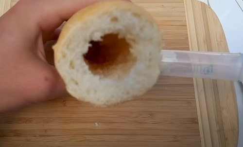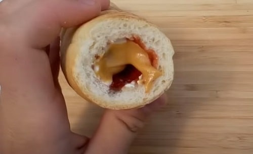 Будь-яким способом зробіть у м’якушці поглиблення всередині, щоб вкласти сосиску і залити соус. Можна, в принципі, просто розрізати булку, але не до кінця. Але тоді соус буде витікати. Тут я пропоную продавити м’якоть великим шприцом – дуже швидко і зручно (надавлюйте, одночасно як би вкручуючи шприц).