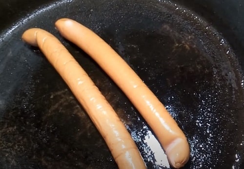 - Зніміть з сосисок плівку, також прожарте і прогрійте на сковороді. Масло можна не додавати.