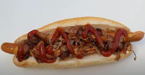 Далі зробіть шар бекону з цибулею. Увенчайте всю конструкцію кетчупом, і знімайте пробу з хот-дога. Приємного апетиту.
