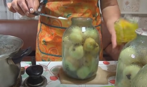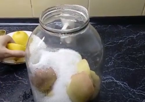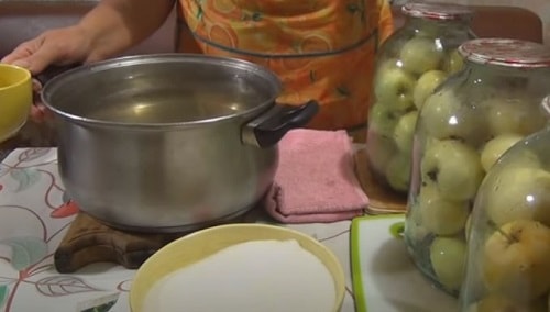 Поки настій закипає, засипте в банки відміряний кількість солодощі. Його кількість залежить від ваших уподобань і сорти яблук. Для солодких плодів кладіть цукру менше.