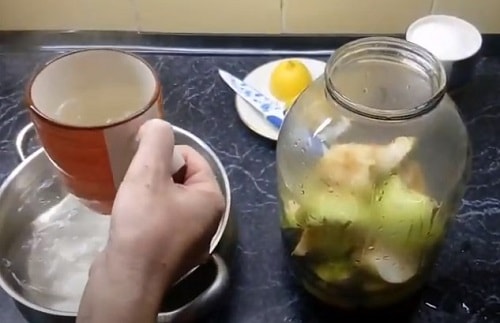 Залийте консервацію окропом. Залиште для прогрівання на 15-20 хвилин, прикривши балони кришками.
