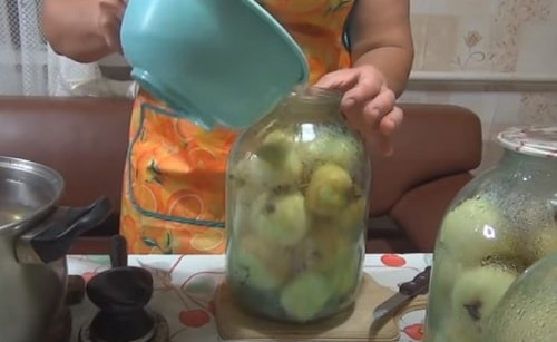 Закип'ятіть воду. Залийте в банки, наповнивши доверху. Наливайте окріп потихеньку, не поспішайте, щоб не лопнуло скло.