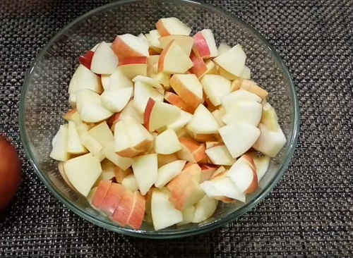 Тепер підготуйте яблука. Шкірку можна не зрізати. Виріжте серцевину, видаливши кісточки. Поріжте шматочками довільної форми. Сильно великої нарізку не робіть.