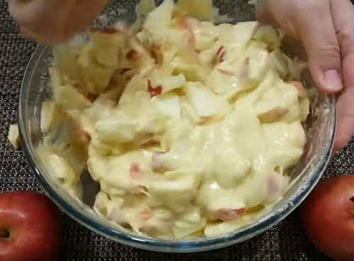 Перекладіть яблучну нарізку в тісто, розмішайте, розподіливши по тесту.