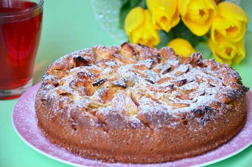 Промажте маслом форму, перелийте тісто. Поставте на середній рівень. Випікайте, встановивши таймер на 40-15 хвилин. орієнтуйтеся на знання вашої печі. Поглядайте в кінці, якщо верх досить зарум’яниться — пора діставати. Не поспішайте відразу пробувати пиріг, нехай постоїть, охолоне. Потім припудріть його для краси, вийміть і наріжте.