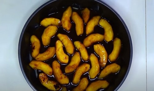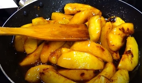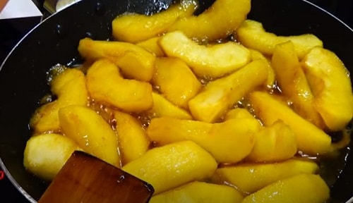 Викладіть яблучну нарізку. Продовжуйте обсмажувати начинку, поки не виділиться сік, а кристали цукру не розтануть остаточно.