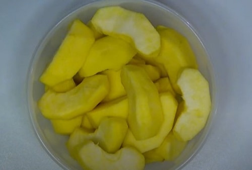 - Видаліть з яблук насіннєву коробку, якщо необхідно, зріжте шкірку. Покришите тонкими часточками або півколами.