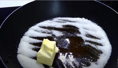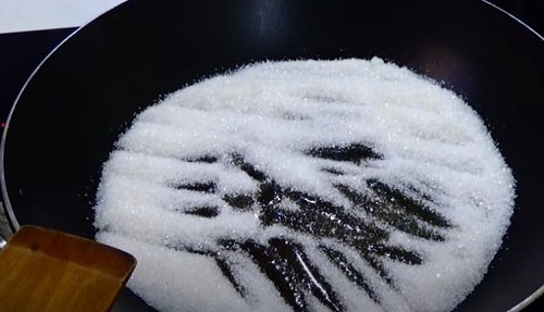 Розігрійте на плиті суху сковороду, насипте цукровий пісок. Прогрівайте його на середньому вогні, поки кристали не стануть плавитися. Помішувати не потрібно. Не чекайте, щоб вони почали карамелізуватися і темніти, переходите до наступного етапу.