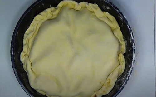 Накрийте начинку тестом, заправте краю всередину, як на фото. Коли пиріг спечеться, повинні вийти бортики, а всередині лежати яблучна начинка.