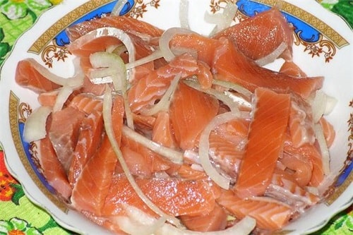 За даним рецептом ви відразу приготуєте готову закуску, з цибулею, маслом, часником. При домашньої засолюванні використовується дуже смачний маринад, беріть його на замітку, оскільки з його допомогою можна готувати будь-яку рибу червоного виду.