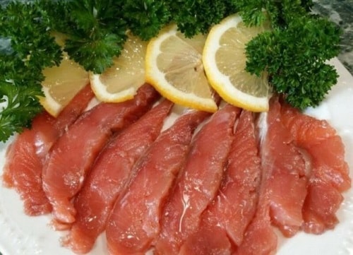 - Тонко, шириною не більше 2-3 мм., Наріжте філе. Розкладіть в один шар на плоску тарілку.