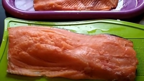 - Випатрайте тушку червоної риби, зріжте плавники, видаліть голову, хвостову частину. Ретельно промийте, поділіть стейками товщиною в 3 сантиметри. Обов'язково просушіть шматки паперовим рушником.