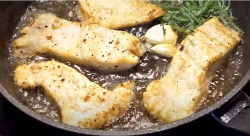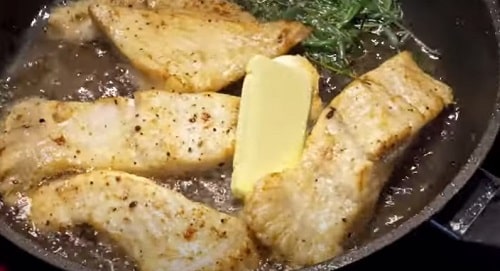 Додайте вершкове масло. Готуйте ще пару хвилин, потім перекладіть рибу на тарілку. Головне – не перепечеться, свіжа камбала смажиться дуже швидко. У цей момент дістаньте часник і трави.