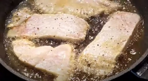 Шматочки бажано припудрити борошном, щоб при смаженні вони тримали форму і не розвалилися. Якщо ви впевнені в тому, що ваша сковорода смажить добре, цей момент допустимо пропустити.