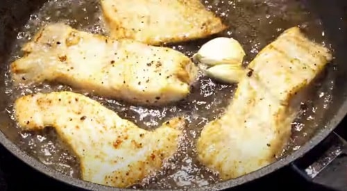 Роздавите ножем часточку часнику, покладіть між шматочками камбали, він додасть аромат рибку. Смажте протягом 2-3 хвилин на повному вогні.