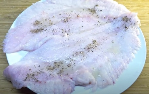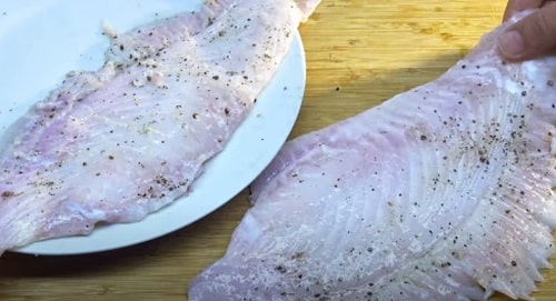 Розправте філе риби. Злегка підсолити, пролийте лимонним соком. Посипте цукром, буквально чуть-чуть, заправте меленим перцем.