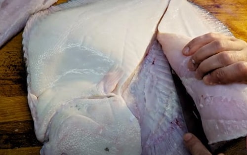 Велика камбала обробляється на філе за дещо іншою технологією. Вона перед вами. М'ясо зрізається безпосередньо з кісток, а до решти частин риби навіть не торкаємося.