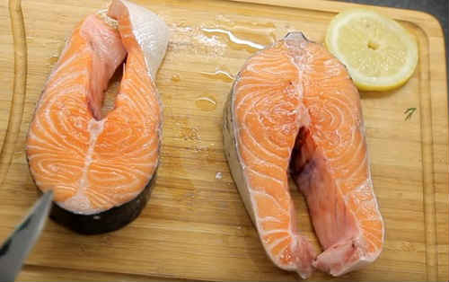 Обробити тушку на стейки сьомги. Промийте, просушіть паперовими серветками – це потрібно зробити обов’язково.