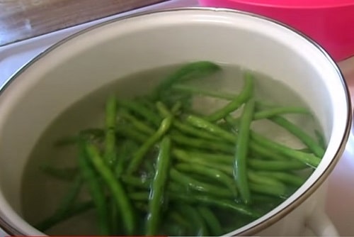 Цей спосіб передбачає попередню термічну обробку овоча. Бланшування вважається найбільш вдалим варіантом, оскільки верхній шар лушпиння квасолі розм'якшується. Це скоротить згодом час приготування страв, до того ж, видалить гіркоту.