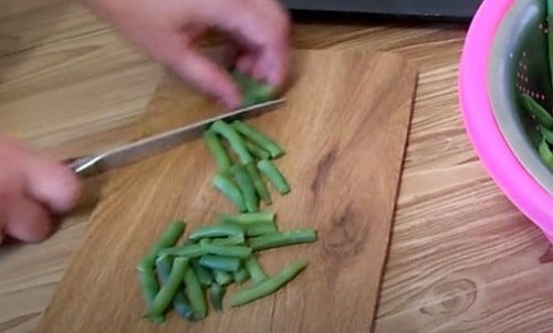 - Обполосніть сировину, зріжте хвостик і кінчик. Покришите шматочками необхідної довжини. Оптимально нарізати квасоля заготовками в 2-4 сантиметри, так їх зручніше готувати.