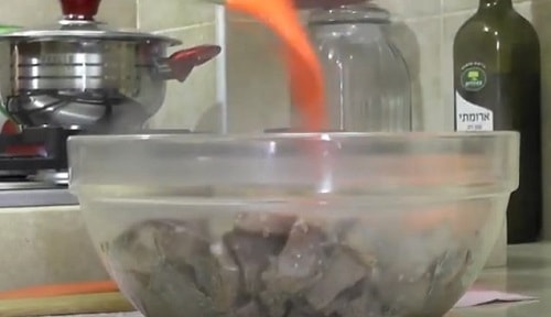 - Обполосніть субпродукт, видаліть плівки, жир, поділіть великими шматочками. Обов'язково підсушіть за допомогою паперових серветок.