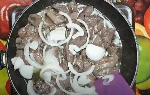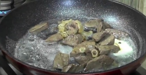 - Наріжте помитий субпродукт брусочками, викладіть в розігрітий жир на сковороду. Обсмажуйте на помірному вогні.