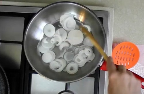 Настругати цибулину кільцями. Розігрійте рослинне масло, викладіть нарізку. Смажте, часто помішуючи, поки цибуля не зарум'яниться. Потім перекладіть в миску.
