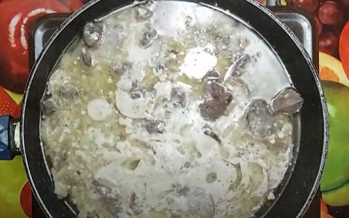- Залийте вершки, дайте закипіти. Сбавьте потужність вогню до мінімуму. Гасіть печінку ще 5 хвилин.