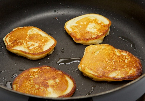 Коли тісто буде готове, столовою ложкою його виливають на розігріту сковорідку і обсмажують за кілька хвилин до утворення золотистої скоринки.