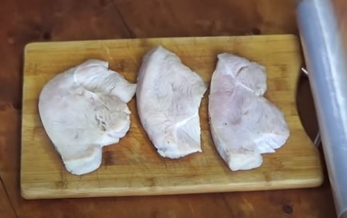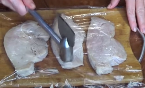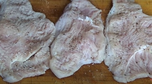 - Накрийте плівкою, побийте молоточком, розбивши волокна. Посоліть, здобріть перцем, викладіть на промаслений лист.