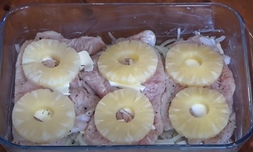- Перекладіть у форму. Оточіть м’ясо підготовленими овочами, частина помістіть на стейки. При бажанні, страва допустимо пролити майонезом, але враховуйте, що калорійність його зросте.