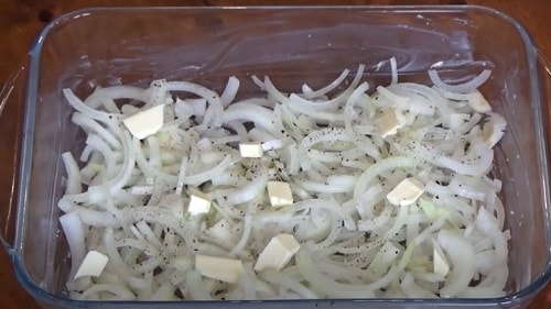 Промажте дно і боковини жароміцної форми вершковим маслом. Викладіть цибульну нарізку, розрівняйте. Трохи підсолити і поперчіть.
