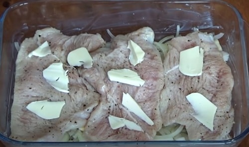 Розкладіть відбите м’ясо, покладіть ще кілька шматочків масла.