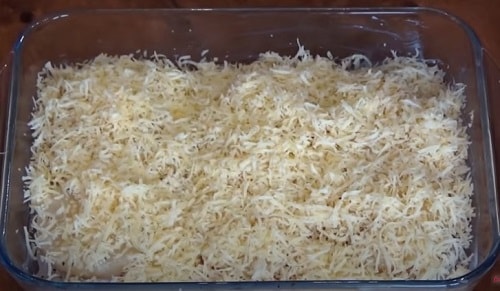 - Натріть сир на крупній крихтою. Посипте на заготівлю, сховавши м’ясо під сиром.
