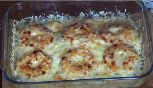 - Запечіть страву при 220 С, включивши таймер на 15-20 хвилин, залежно від величини стейків. Про готовність страви вам підкаже рум’яна кірочка на сирній шапочці.