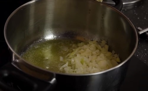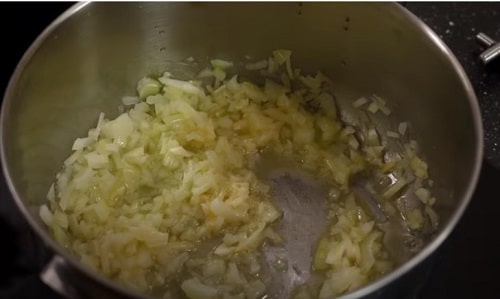 - Хлюпніть в каструлю з товстим дном масло, викладіть цибулю. Помішуючи, обсмажуйте приблизно 5 хвилин.