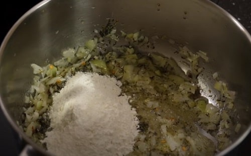 Додайте борошно, щоб суп вийшов густим. Швидко перемішайте.