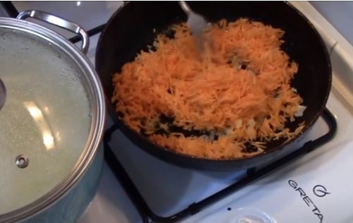 Потріть крупною стружкою моркву, відправте до цибулі. Обсмажуйте до красивої рум'яності.